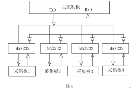 主控制板與采集板之間的通信電路采用主從總線拓撲結(jié)構(gòu),以主控制板為主機,采集板為從機,每塊采集板的通信接口與RS232芯片連接,為防止輸出端電平相互影響,在從機的發(fā)送端和主機的接收端之間串入一個二極管。為保證機和從機正常的傳送數(shù)據(jù),需要有一套完整的信息傳輸模式,數(shù)據(jù)格式以及內(nèi)容的規(guī)約協(xié)議。主機向所有從機發(fā)送帶地址信息的指令報文,被尋址從機根據(jù)指令報文中功能碼做出應答或動作,每個從機都有各自的獨立的地址,主機向從機發(fā)送的各種指令報文和從機所發(fā)的報文都是以從機的地址為開頭的,從機只讀取發(fā)給自己的指令,對以其它從機開頭的報文不做應答。