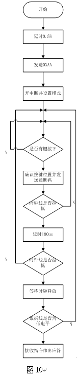 按鍵延遲0.5S后向主板發(fā)送0XAA通知主板。開總中斷、外部中斷,設(shè)置中斷觸發(fā)模式,將時鐘線、數(shù)據(jù)線連在微處理器的中斷引腳上,掃描鍵盤,看是否有按鍵按下,確定按鍵的位置,發(fā)送相應的碼。判斷時鐘線是否為低電平,如是則延時100US再判斷時鐘線是否為低,等待時鐘釋放,再看數(shù)據(jù)線是否為低,為低則表明主板在請求發(fā)送數(shù)據(jù),根據(jù)主板發(fā)來的指令作出相應的應答和動作。
