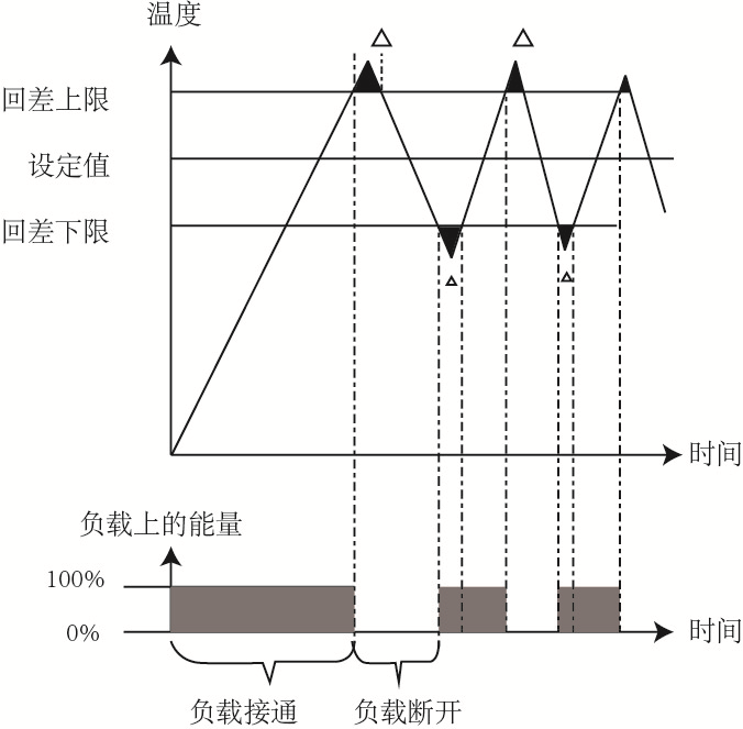 (一)二位式調(diào)節(jié)又稱通斷式控制,是將測量值與設(shè)定值相比較之差值經(jīng)放大處理后,對調(diào)節(jié)對象作開或關(guān)控制的調(diào)節(jié)。當(dāng)測量值低于設(shè)定值時,儀表輸出“通”的信號,負(fù)載因獲得全部能源而升溫;當(dāng)測量值高于設(shè)定值時,儀表輸出“斷”的信號,負(fù)載因失去全部能源而降溫;須指出由傳感器-儀表-執(zhí)行器(閥門或接觸器)-負(fù)載(電爐)-傳感器各部分組成的閉環(huán)系統(tǒng)在信號的傳遞、處理和調(diào)節(jié)中都不可避免地存在滯后,故儀表作出調(diào)節(jié)輸出后,需要一定的時間才能把調(diào)節(jié)結(jié)果再通過傳感器反饋至儀表,在此段滯后時間內(nèi),調(diào)節(jié)對象的溫度仍呈慣性上升或慣性下降,儀表此時處于“失控”階段。能源全部接通和全部關(guān)斷二種狀態(tài)的交替出現(xiàn),必然使被控參數(shù)有周期性的起伏,形成在設(shè)定值上下的震蕩,震蕩的幅度由儀表的回差(又稱開關(guān)差)和感溫元件的響應(yīng)時間、加熱器的熱阻等系統(tǒng)其他部分的特性所決定。這在二位式調(diào)節(jié)中無法避免。但在空調(diào)、農(nóng)業(yè)培植等允許溫度有一定范圍波動的場合,可避免執(zhí)行器的頻繁動作,反有利于系統(tǒng)的運(yùn)行。