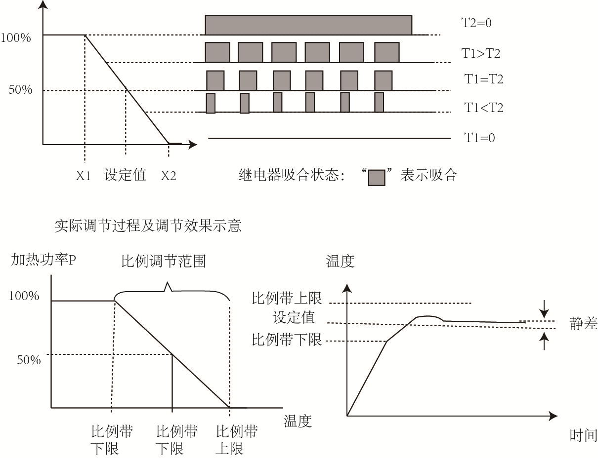 時間比例調(diào)節(jié)的基本原理:當(dāng)實際溫度進(jìn)入儀表的下比例帶時,繼電器即開始周期性地釋放、吸合,靠改變吸與放的時間之比值來改變加熱負(fù)載上的平均加熱功率,從而改變溫度的目的。吸放的時間同設(shè)定值與測量值的偏差成正比,即偏差越大,單位時間(即吸放周期T)內(nèi)吸合時間越長,反之越短;當(dāng)偏差為零時,吸放為等周期,而出現(xiàn)負(fù)偏差時,吸合時間比釋放時間短,直至測量值到達(dá)比例帶上限,繼電器不再吸合,負(fù)載上無輸出。