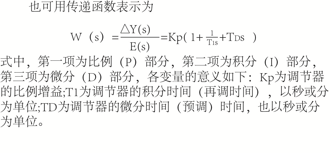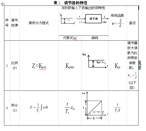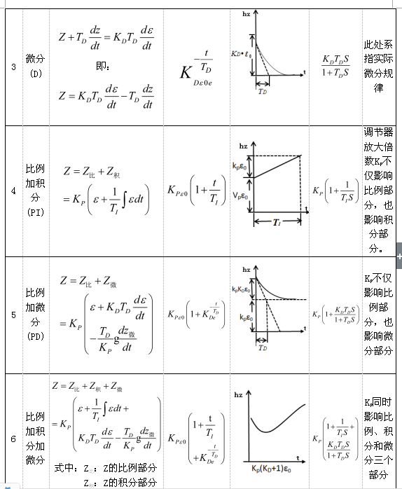 調(diào)節(jié)器的調(diào)節(jié)規(guī)律或稱調(diào)節(jié)器的特性。第一種稱為比例調(diào)節(jié)規(guī)律,第二種稱為積分調(diào)節(jié)規(guī)律,第三種稱為微分調(diào)節(jié)規(guī)律。此外就是比例加積分,比例加微分以及比例加積分加微分調(diào)節(jié)規(guī)律。這些調(diào)節(jié)規(guī)律的微積分方程式、在階躍(即訊號一下子)輸入下的輸出時間特性以及傳遞函數(shù)等。