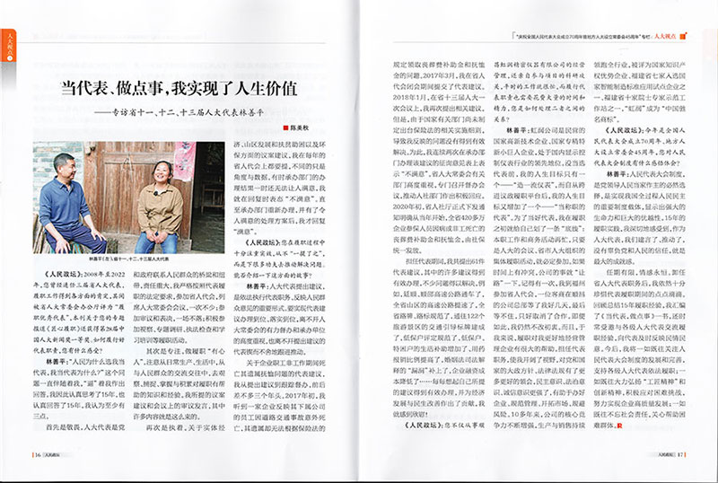 林善平:虹潤公司是民營的國家高新技術(shù)企業(yè)、國家專精特新小巨人企業(yè),處于國內(nèi)顯示控制儀表行業(yè)的領(lǐng)先地位。沒當(dāng)選代表前,我的人生目標(biāo)只有一個——“造一流儀表”,而自從跨進(jìn)議政履職平臺后,我的人生目標(biāo)又增加了一個——“當(dāng)稱職的代表”。為了當(dāng)好代表,我在履職之初就給自己劃了一條“底線”:本職工作和商務(wù)活動再忙,只要是人大的會議、省市人大組織的集體履職活動,就必定參加。如果時間上有沖突,公司的事就“讓路”一下。記得有一次,我到福州參加省人代會,一位客商在順昌的公司總部等了我好幾天,最后等不住,只好取消了合作。即便如此,我仍然不改初衷。而且,于我來說,履職對我更好地經(jīng)營管理企業(yè)有很大的幫助。擔(dān)任代表職務(wù),使我開闊了視野,對黨和國家的大政方針政策、法律法規(guī)有了更多更好的領(lǐng)會,民主意識、法治意識、誠信意識更強(qiáng)了,有助于辦好企業(yè)、規(guī)范管理、開拓市場、規(guī)避風(fēng)險。10多年來,公司的核心競爭力不斷增強(qiáng),生產(chǎn)與銷售持續(xù)領(lǐng)跑全行業(yè),被評為國家知識產(chǎn)權(quán)優(yōu)勢企業(yè)、福建省七家入選國家智能制造標(biāo)準(zhǔn)應(yīng)用試點(diǎn)企業(yè)之一、福建省十家院士專家示范工作站之一,“虹潤”成為“中國馳名商標(biāo)”。