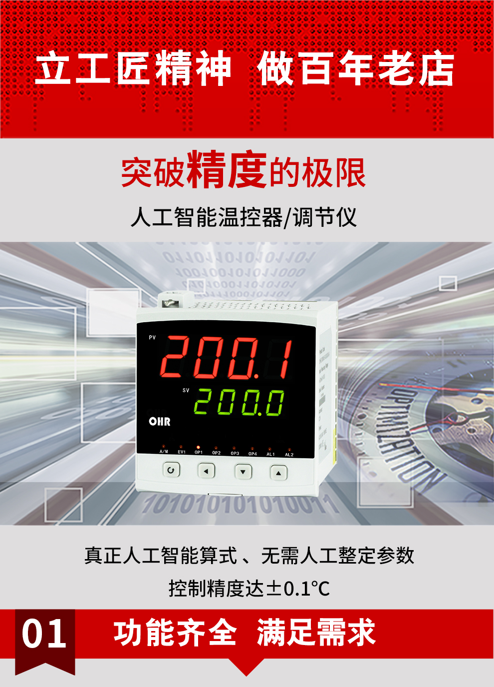 OHR-E300系列人工智能調(diào)節(jié)儀采用真正的人工智能算式,儀表啟動(dòng)自整定功能,可以根據(jù)被控對(duì)象的特性,自動(dòng)尋找參數(shù)以達(dá)到很好的控制效果,無需人工整定參數(shù)??販鼐然具_(dá)±0.1℃,無超調(diào)、欠調(diào),達(dá)國(guó)際先進(jìn)水平。