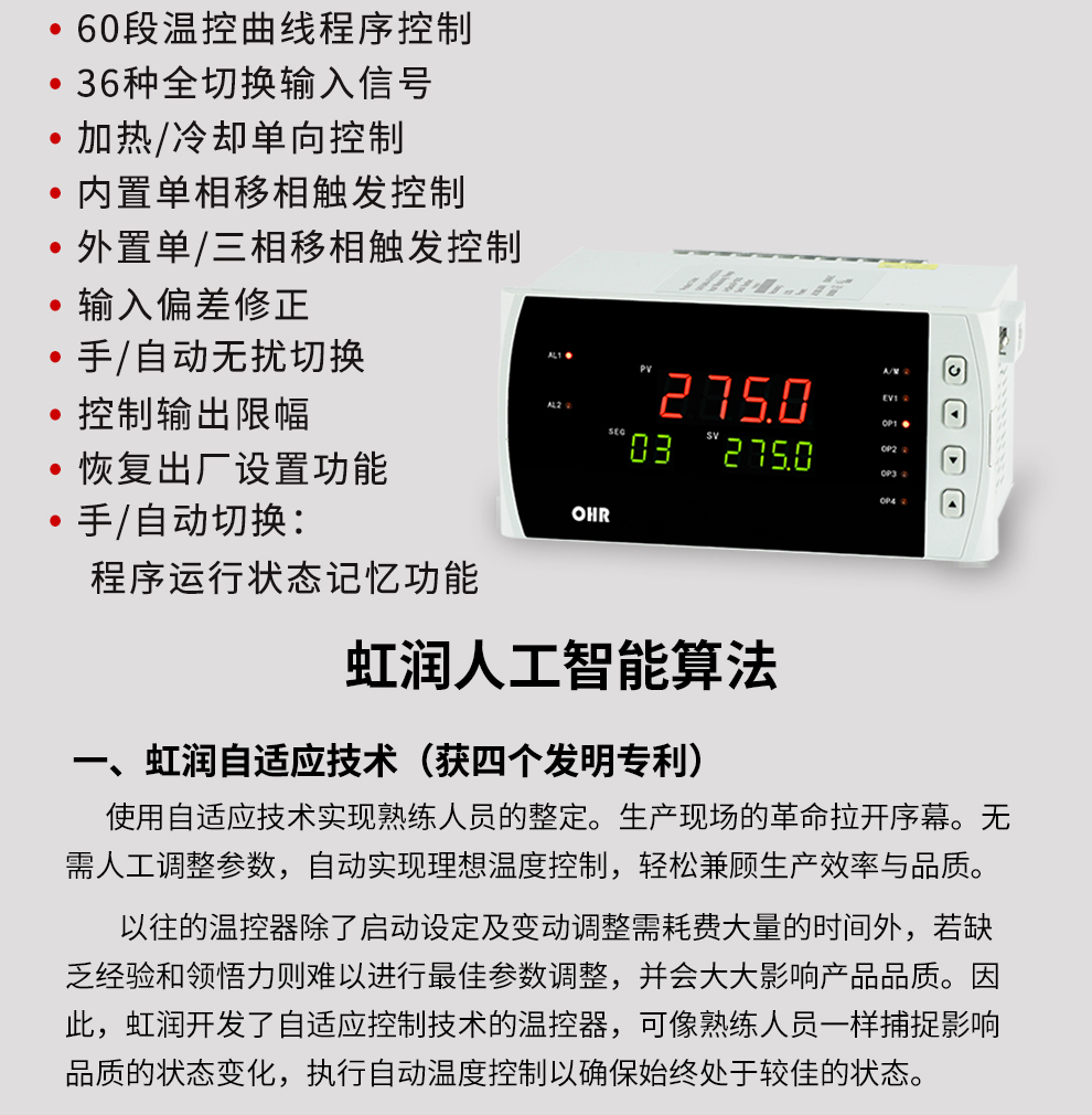 OHR-E400系列60段人工智能溫控器采用真正的人工智能算式,儀表啟動(dòng)自整定功能,可以根據(jù)被控對象的特性,自動(dòng)尋找參數(shù)以達(dá)到很好的控制效果,無需人工整定參數(shù)??販鼐然具_(dá)±0.1℃,無超調(diào)、欠調(diào),達(dá)國際先進(jìn)水平。