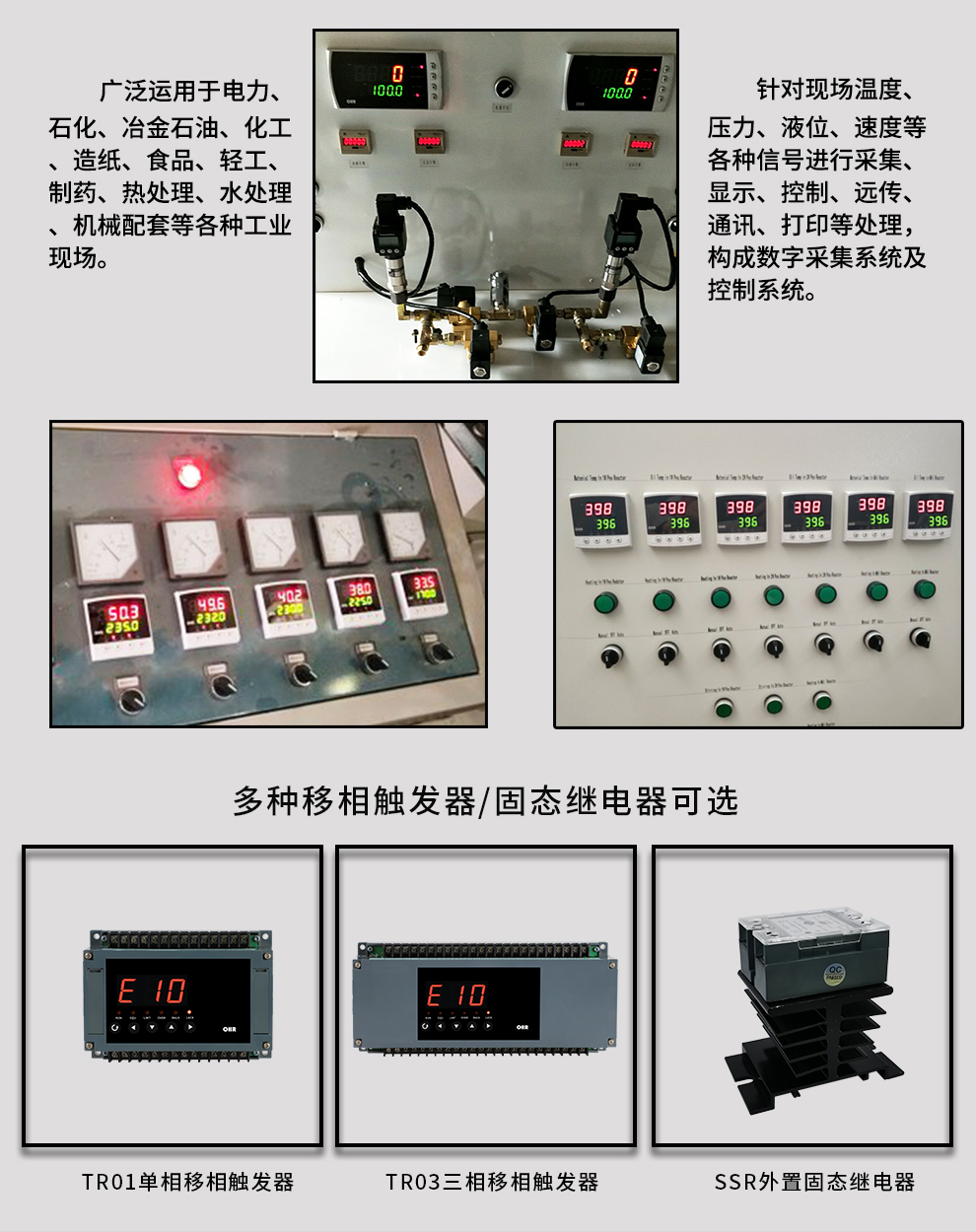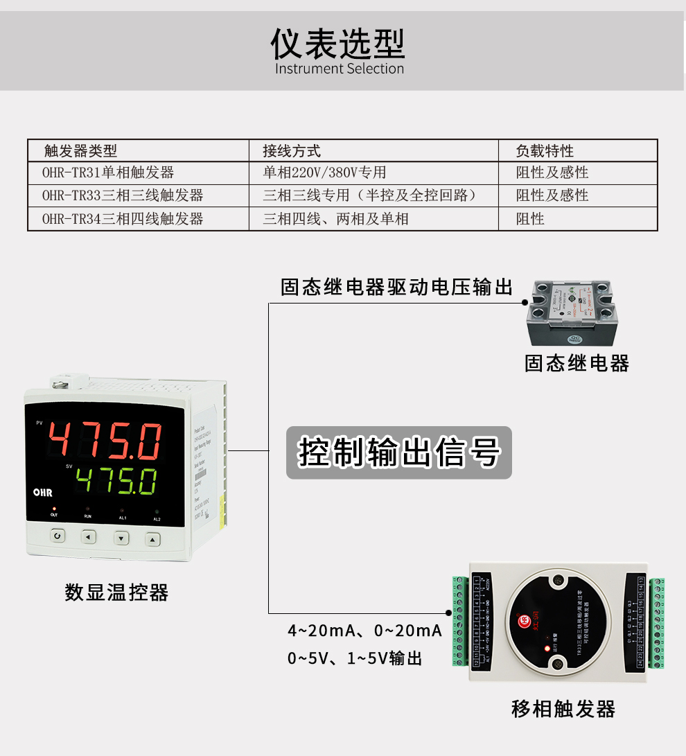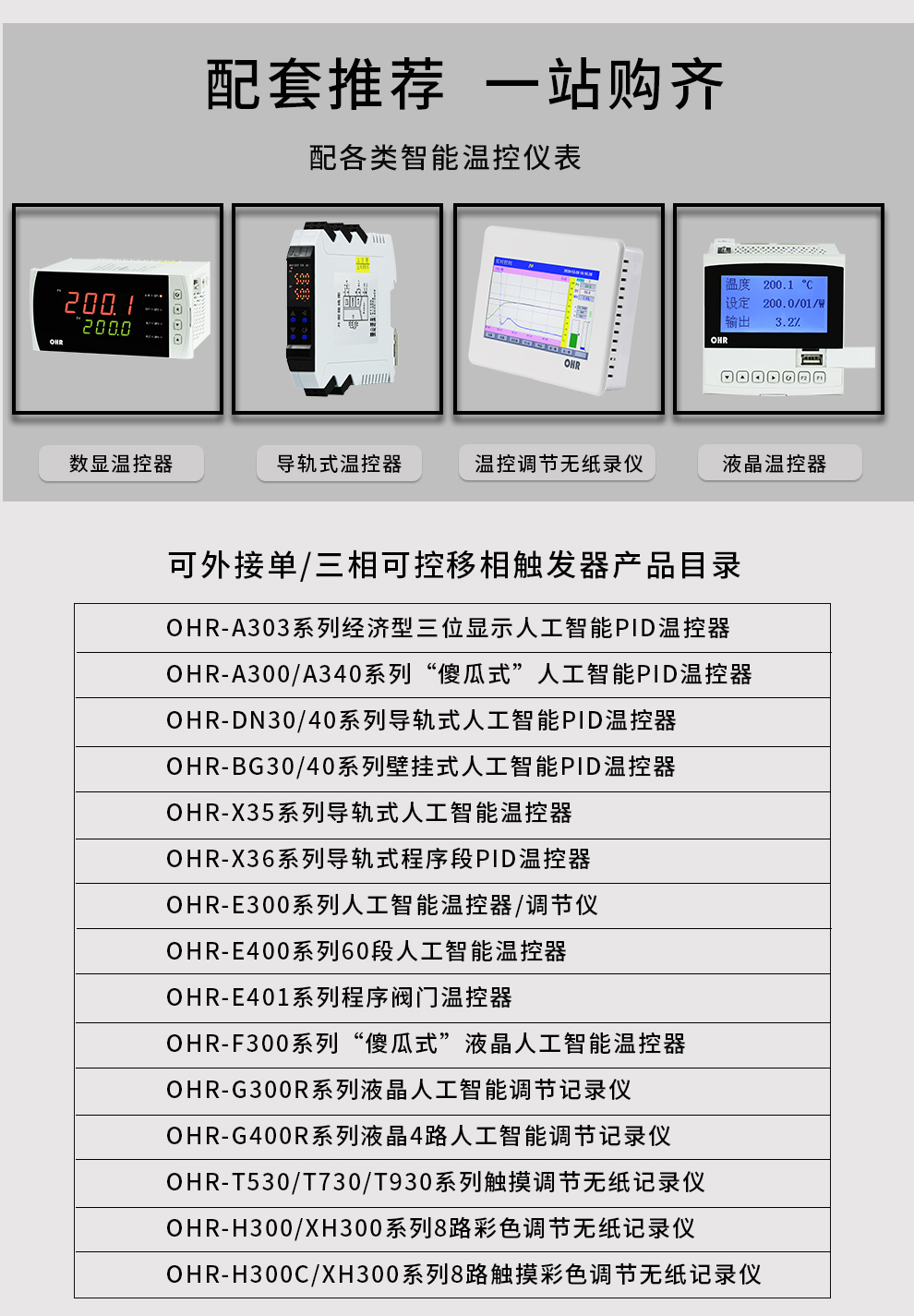 OHR-TR30系列移相觸發(fā)器是應(yīng)用了單片機(jī)技術(shù)的智能化單/三相移相觸發(fā)器,功能強(qiáng)大且可靠性高,能適應(yīng)各種 電阻絲、硅碳棒及負(fù)載采用變壓器降壓的硅鉬棒、鎢絲等各種類(lèi)型工業(yè)電爐,也可用于電機(jī)軟啟動(dòng)的控制。