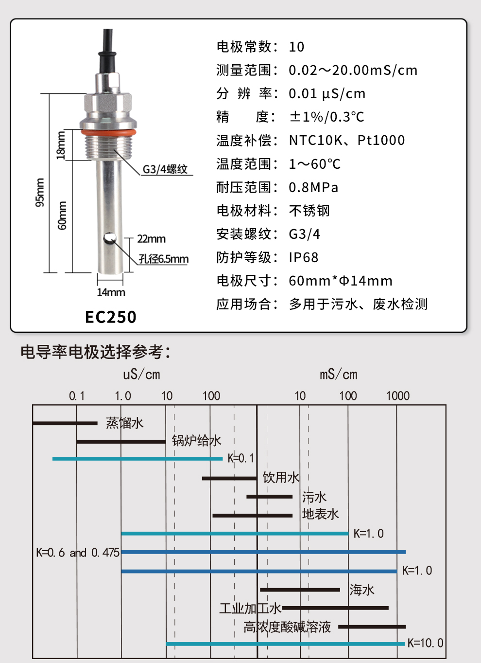 OHR-EC10A系列電導率在線監(jiān)測儀可對工業(yè)用水的電導率(TDS)值進行連續(xù)測量和控制。用戶可以通過監(jiān)測儀的 界面配置和校準實現(xiàn)模擬輸出,可以實現(xiàn)繼電器控制及數(shù)字通訊等功能。廣泛應(yīng)用于RO、超純水、冷卻水、鍋 爐水、工業(yè)制程及水處理等溶液中電導率/TDS和溫度的連續(xù)監(jiān)測。