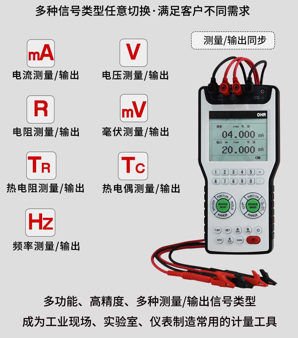 OHR-A00過程校驗儀是一種多功能、高精度的便攜式儀器,可用于校準、測試工業(yè)過程裝置及各種電氣設(shè)備,支持電流、電壓、電阻、頻率、熱電偶、熱電阻等多種信號類型,最高精度可達0.01%F.S,是工業(yè)現(xiàn)場、實驗室以及各類儀表制造商必備的計量測試工具。