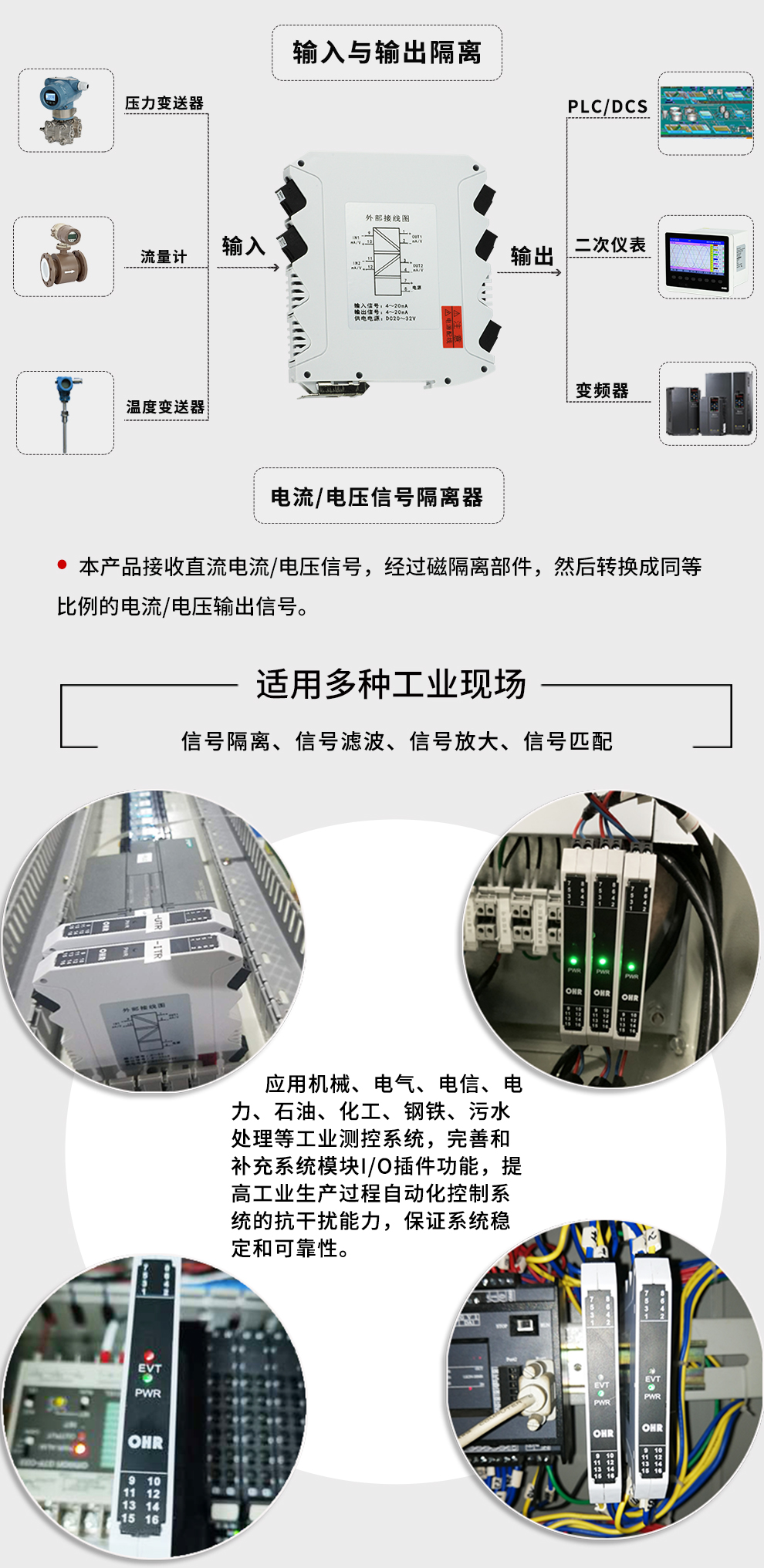 OHR-M21系列電壓/電流隔離器將直流電壓或電流信號(hào)經(jīng)過隔離傳送,轉(zhuǎn)換成所需的信號(hào)給其它儀表。可以與單元組合儀表及DCS、PLC等系統(tǒng)配套使用,給予現(xiàn)場(chǎng)儀表信號(hào)隔離、信號(hào)轉(zhuǎn)換、信號(hào)分配、信號(hào)處理等,從而提高工業(yè)生產(chǎn)過程自動(dòng)控制系統(tǒng)的抗干擾能力,保證系統(tǒng)的穩(wěn)定性和可靠性。