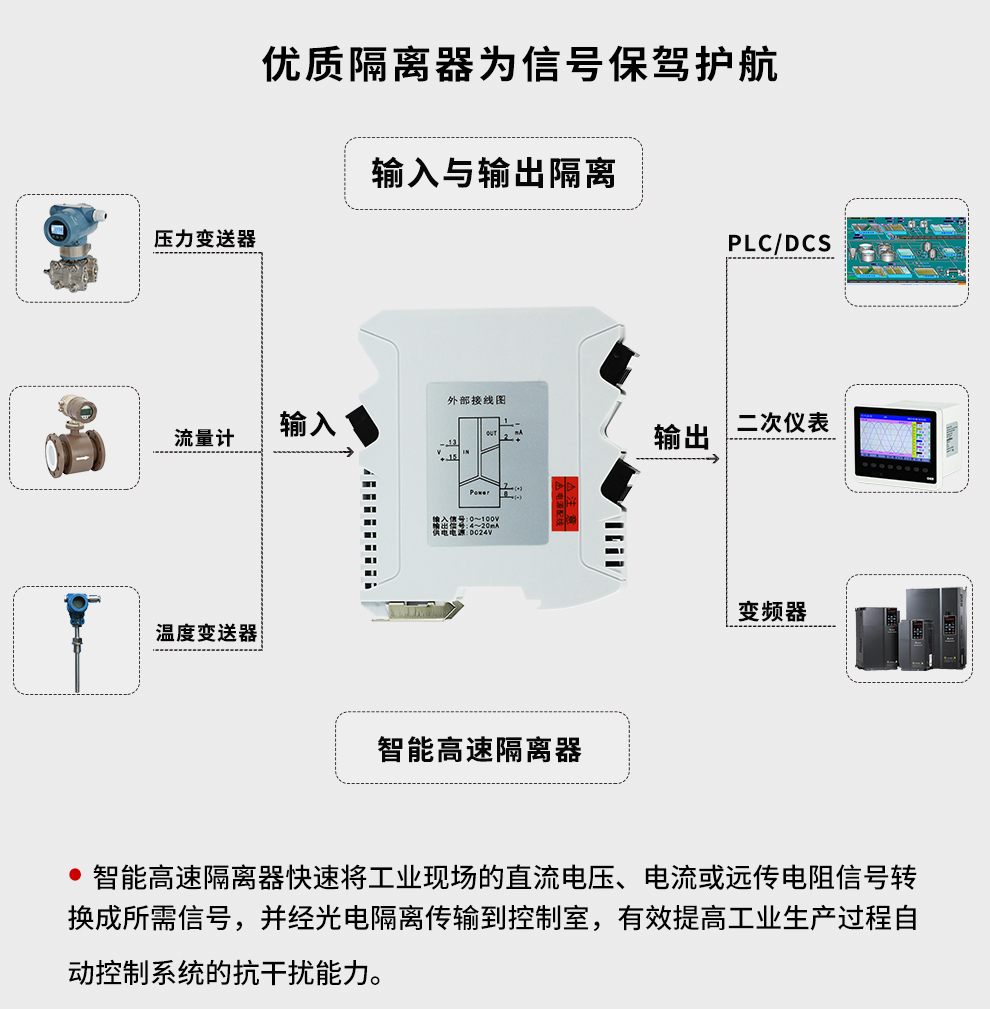 OHR-M38系列智能高速隔離器將工業(yè)現(xiàn)場的直流電壓、電流或遠(yuǎn)傳電阻信號轉(zhuǎn)換成所需信號,經(jīng)隔離傳輸?shù)娇刂剖?,有效提高工業(yè)生產(chǎn)過程自動(dòng)控制系統(tǒng)的抗干擾能力。