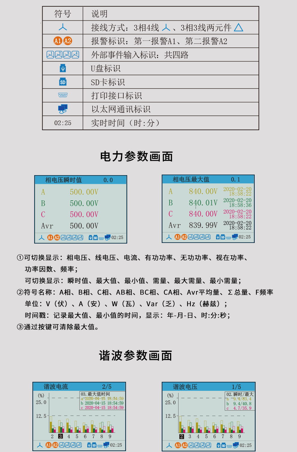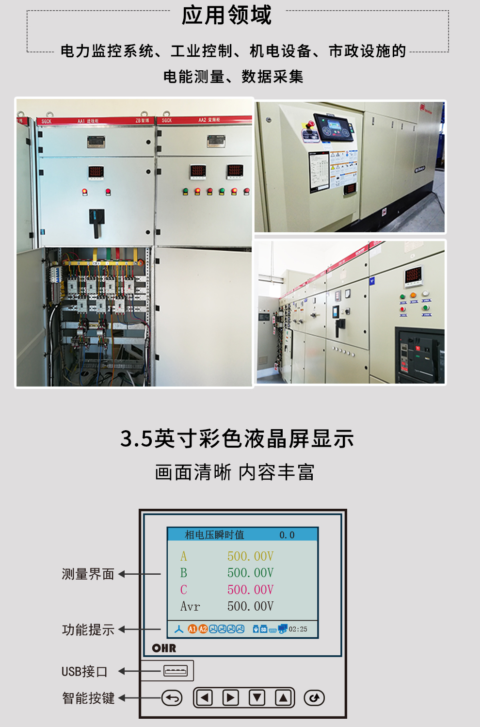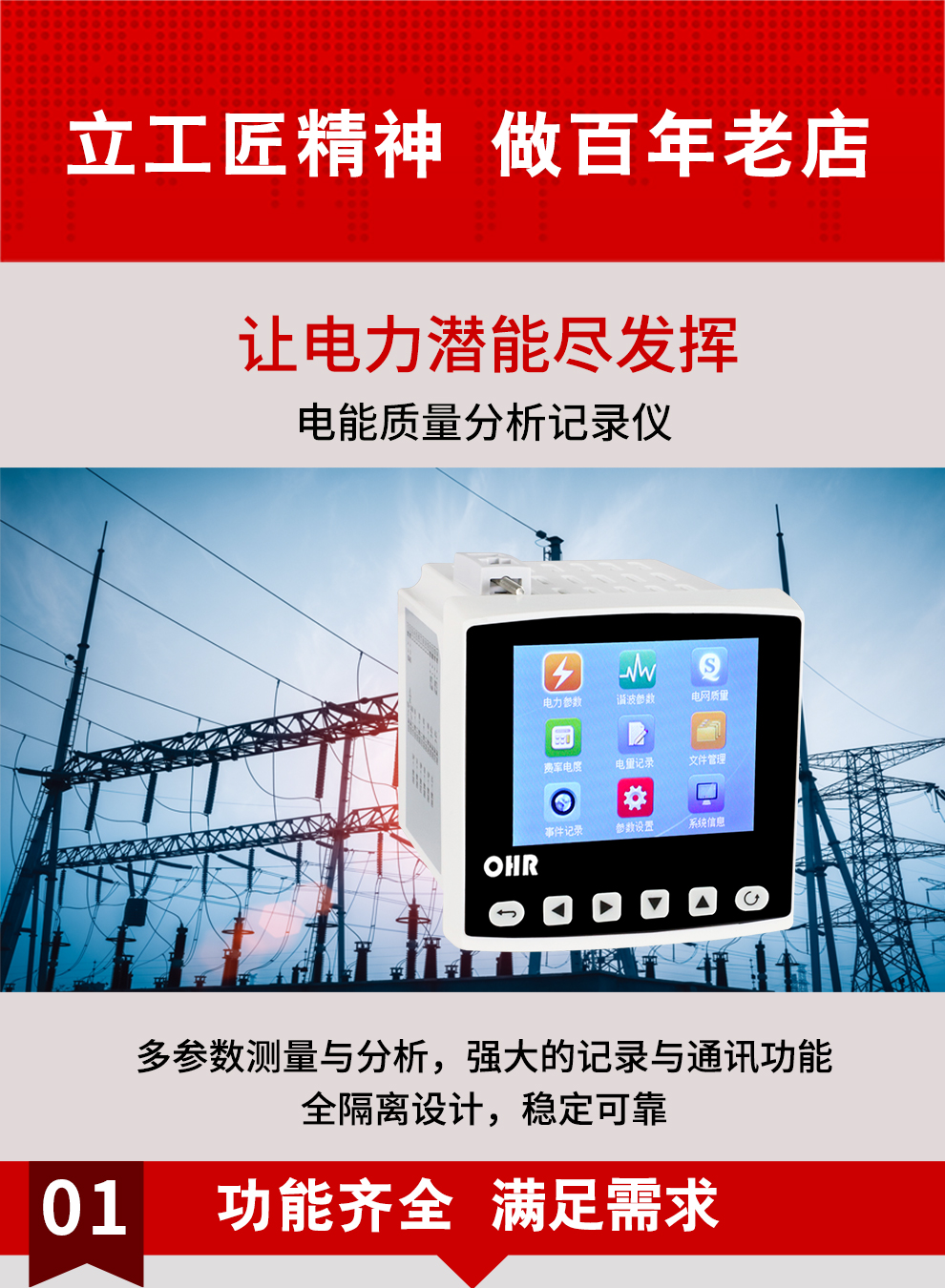 OHR-C900系列電能質(zhì)量分析記錄儀采用新進(jìn)的集成電路及數(shù)字采樣技術(shù),對三相電氣線路中的交流電流/電壓、 有功功率、無功功率、視在功率、功率因數(shù)、工頻周波、諧波、有功電能、無功電能、四象限電能、波峰系數(shù) 及不平衡度等進(jìn)行實(shí)時測量顯示與在線分析。