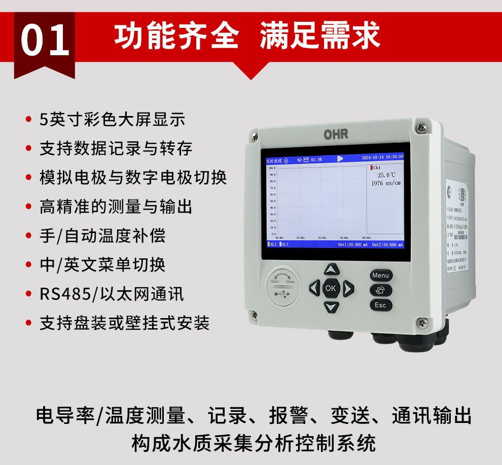 OHR-EC80系列電導(dǎo)率記錄儀是一款在線化學(xué)分析記錄控制器,可對(duì)工業(yè)用水的電導(dǎo)率 /TDS值進(jìn)行連續(xù)測(cè)量和控制。記錄儀具有兩路模擬信號(hào)輸出、兩路繼電器報(bào)警輸出以及 RS485/以太網(wǎng)通訊輸出等功能,方便用戶進(jìn)行數(shù)據(jù)傳輸和監(jiān)控。具有強(qiáng)大的顯示功能,使用戶能夠清晰地了解系統(tǒng)運(yùn)行情況。