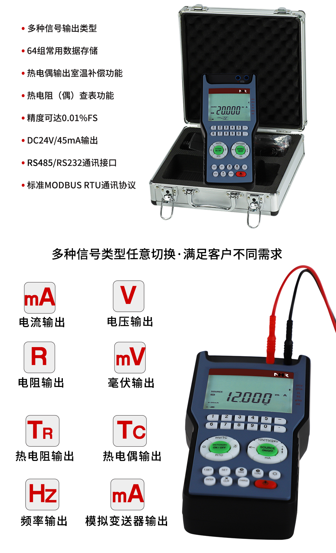 NHR-200信號(hào)發(fā)生器是一種多功能、高精度的便攜式信號(hào)源,可用于輸出各種規(guī)格的工業(yè)信號(hào),支持電流、電壓、電阻、頻率、熱電偶、熱電阻等多種信號(hào)輸出類型,最高精度可達(dá)0.01%F.S,是工業(yè)現(xiàn)場、實(shí)驗(yàn)室以及各類儀表制造商必備的計(jì)量測試工具。