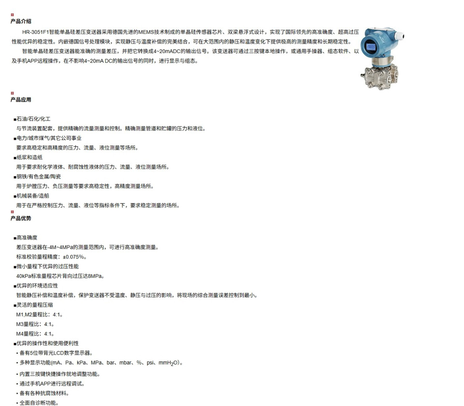 HR-3051F1智能單晶硅差壓變送器