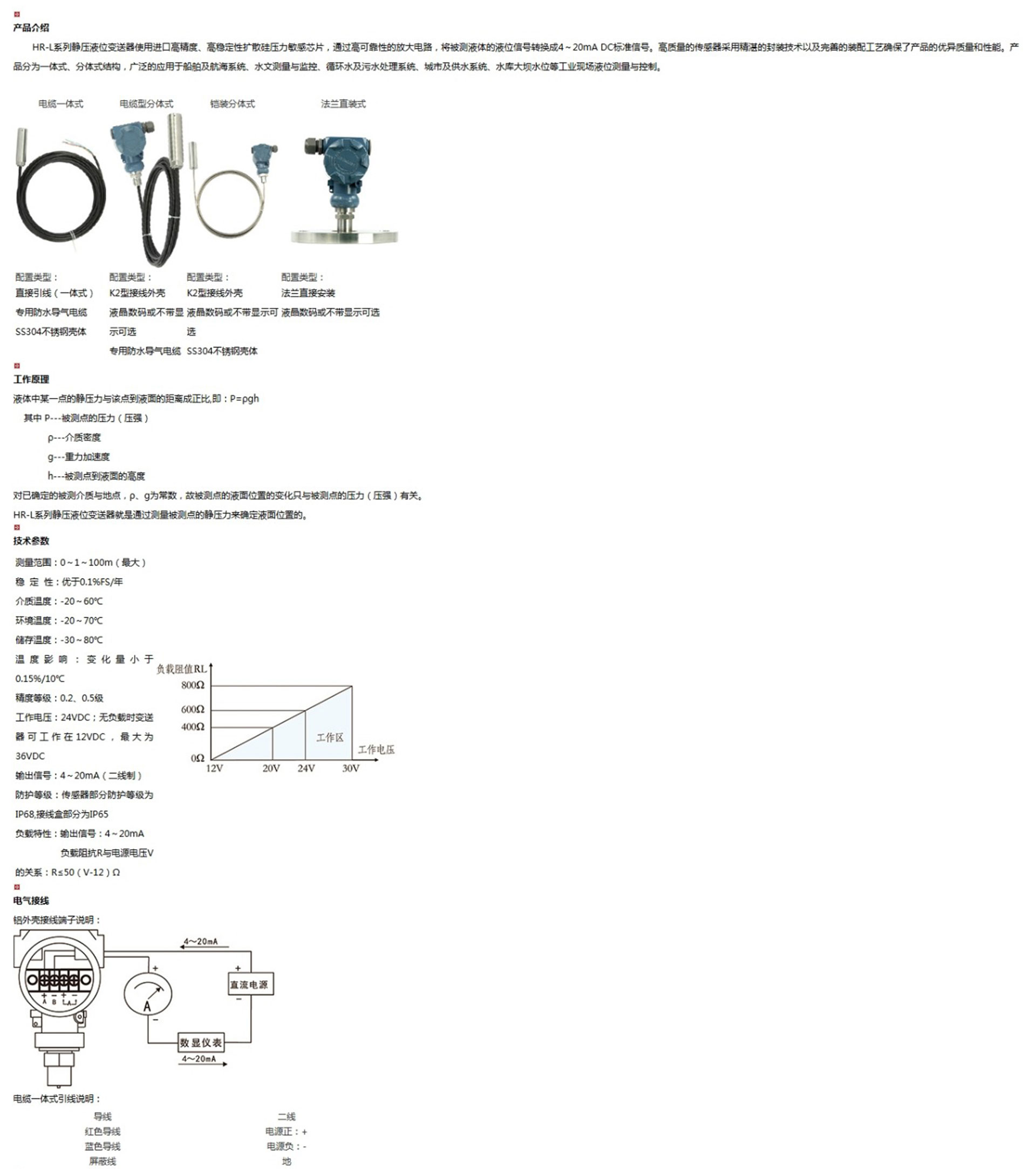 HR-L系列靜壓液位變送器使用進口高精度、高穩(wěn)定性擴散硅壓力敏感芯片,通過高可靠性的放大電路,將被測液體的液位信號轉(zhuǎn)換成4~20mA DC標準信號。