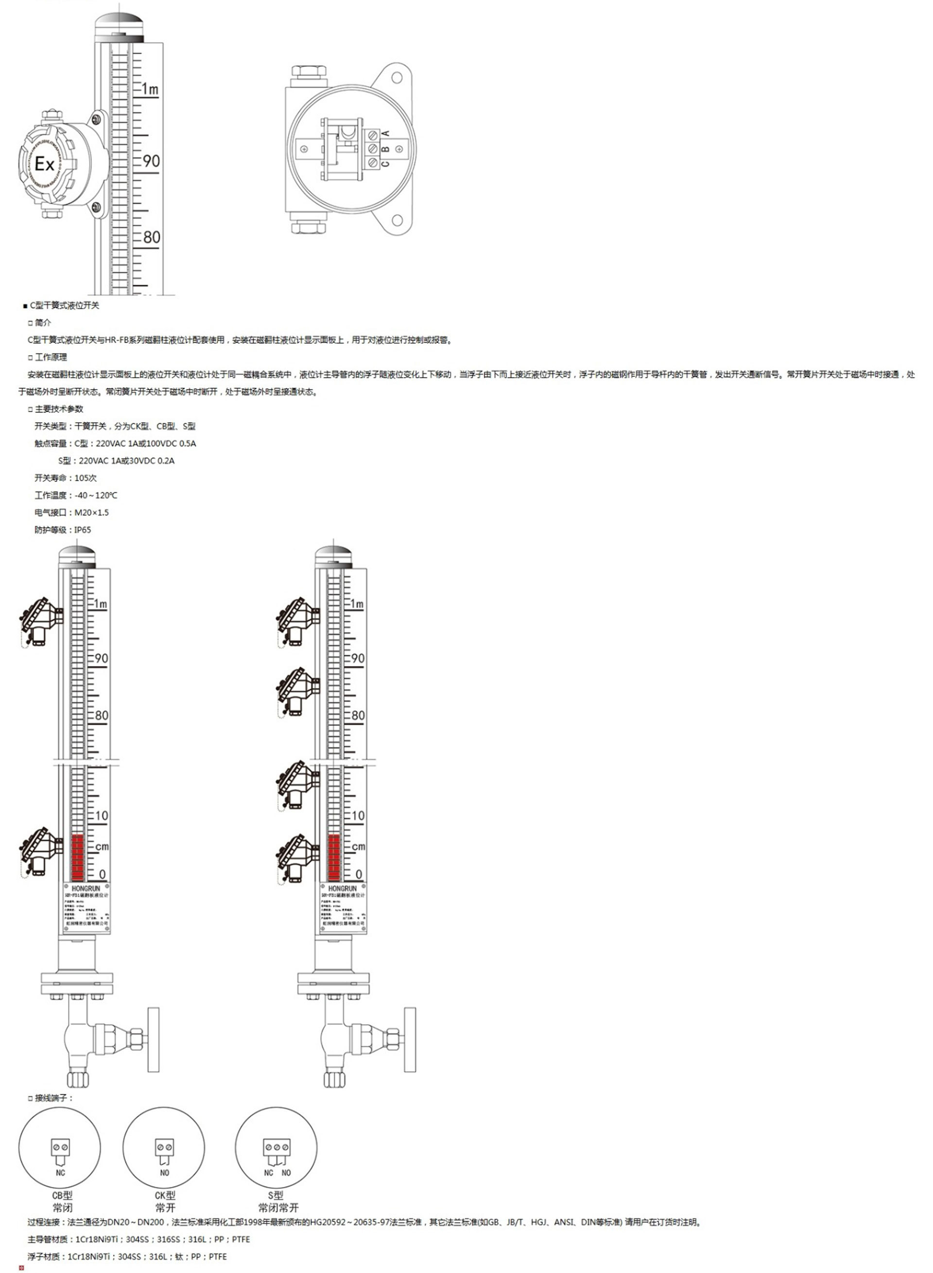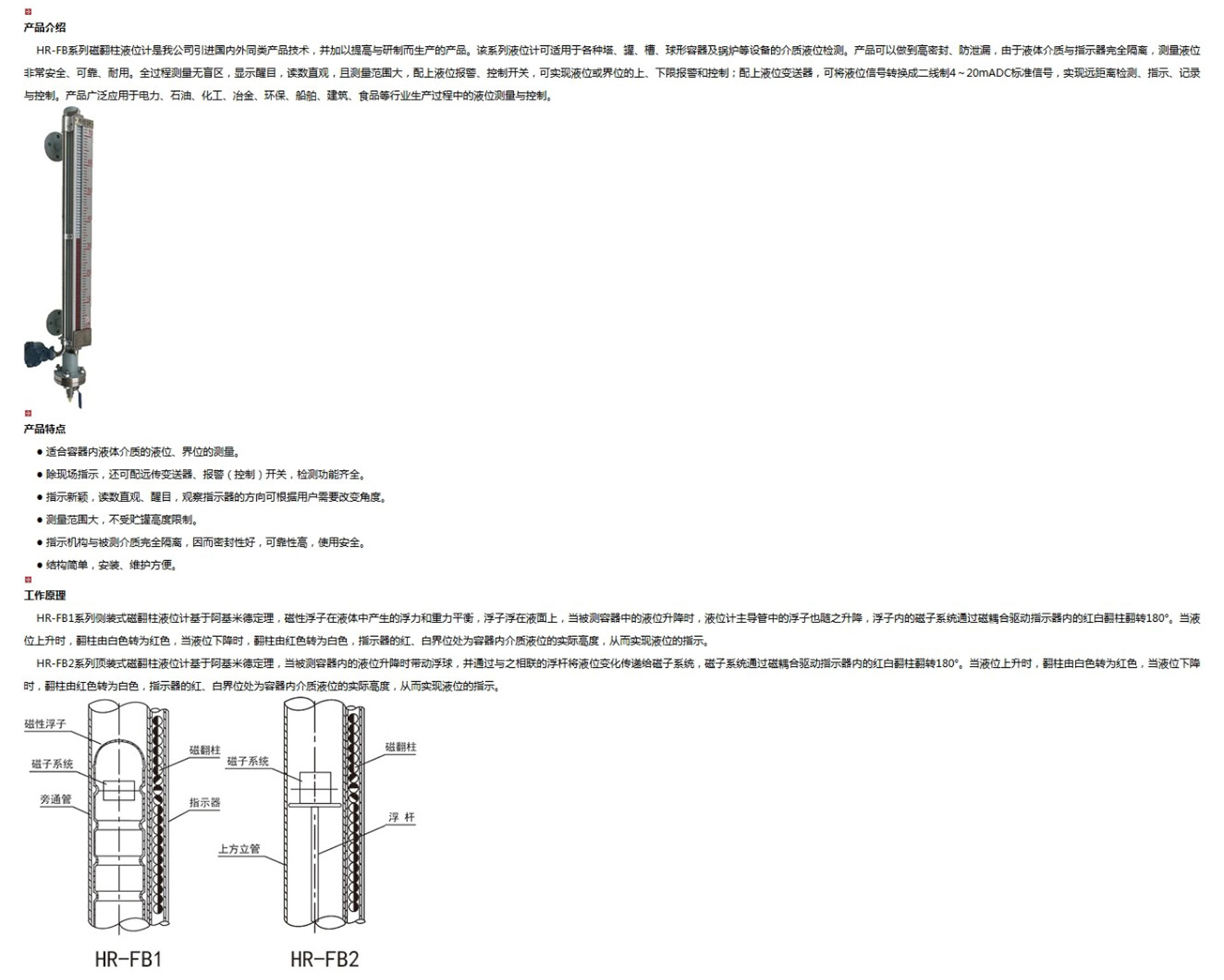 HR-FB系列磁翻柱液位計是我公司引進(jìn)國內(nèi)外同類產(chǎn)品技術(shù),并加以提高與研制而生產(chǎn)的產(chǎn)品。該系列液位計可適用于各種塔、罐、槽、球形容器及鍋爐等設(shè)備的介質(zhì)液位檢測。產(chǎn)品可以做到高密封、防泄漏,由于液體介質(zhì)與指示器完全隔離,測量液位非常安全、可靠、耐用。